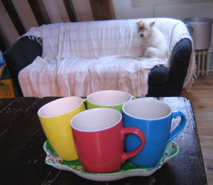 Bij de HEMA waren de gekleurde mokken in de reclame. Ieder zijn eigen kleur voor in Frankrijk, dacht ik.