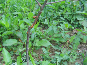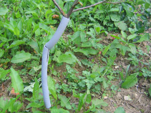 Op aanraden van Jean Pierre heb ik de fruitboompjes een anti-hert-manchetje gegeven. Een tuinslang doorsnijden en hop, klaar is kees.