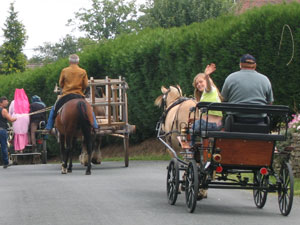 ‘s Middags was dan eindelijk het F?‚Äö?묢te du Cheval in St. Sebastien, waarvoor we dat pak hadden gemaakt. Gespannen kinderen en paarden, die (de paarden) zich uiteindelijk zo opgewonden gingen gedragen, dat er een paar naar de manege werden teruggestuurd. Saar mocht op de bok bij de Fjord Lola, en Siebe en ik reden in de hooiwagen naar het feestterrein.