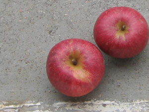We mochten van de tweelingdames van de zomer appeltjes rapen. Ze hebben een stuk of zes bomen op het weitje achter ons staan en een ervan draagt de allerheerlijkste rode appeltjes, met hagelwit vruchtvlees.