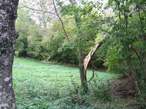 Op ons terrain bleek deze wilde kers zwaar gewond. Storm of bliksem? Die moet ook nog opgeruimd.