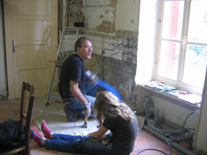 Boven het oude aanrecht hing een houten kastje. Dat was wel aardig met veel originele details, maar hing zo raar en te laag ten opzichte van het nieuwe aanrecht, dat het eraf moest. Jammer genoeg was het zoveel jaar geleden met veel spijkers, gipsplaat en tegen de hoofdleiding van waterleiding opgehangen, dat het slechts met gecontroleerd geweld is gelukt. Saar is dol op bouwvakachtige bezigheden en liep stoer als een amanuensis met een veiligheidsbril haar vader te helpen.