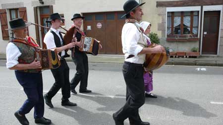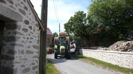 Kan ik nog een handje helpen, vroeg ik aan Jean Pierre. Stap maar in! En voor het eerst van mijn leven heb ik in een trekker gereden, met air-conditioning en radio. We kletsten gezellig tot we bij de wei waren, zijn moeder reed met een andere trekker achter ons aan en daarmee laadde hij de hooibalen weer op de aanhanger. Paulette en ik (en haar hond) stonden ondertussen naar het dal te kijken en naar de bende die de sangliers hadden aangericht. Zondag begint de jacht, had ik al van mevrouw A. van de schuur gehoord.